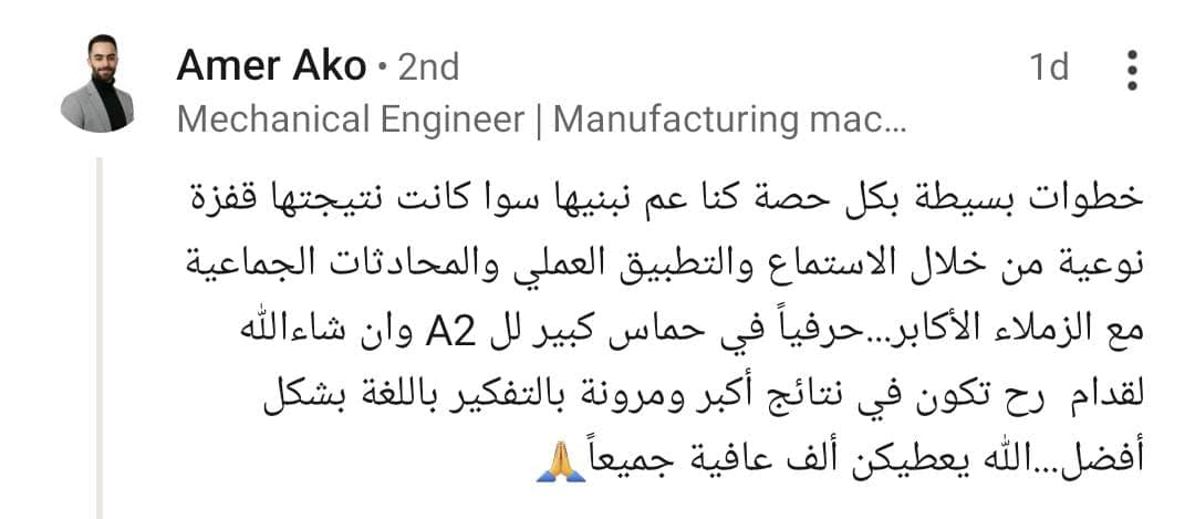 “خطوات بسيطة بكل حصة… كانت نتيجتها قفزة نوعية: استماع، تطبيق عملي، ومحادثات جماعية. إن شاء الله القادم أفضل.”