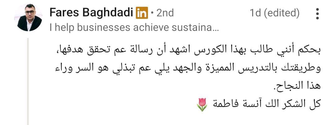 “بحكم أنني طالب بهذا الكورس أشهد أن رسالته عم تحقق هدفها، وطريقتكِ بالتدريس المميزة والجهد يلّي عم تبذليه هو السر وراء النجاح.”
